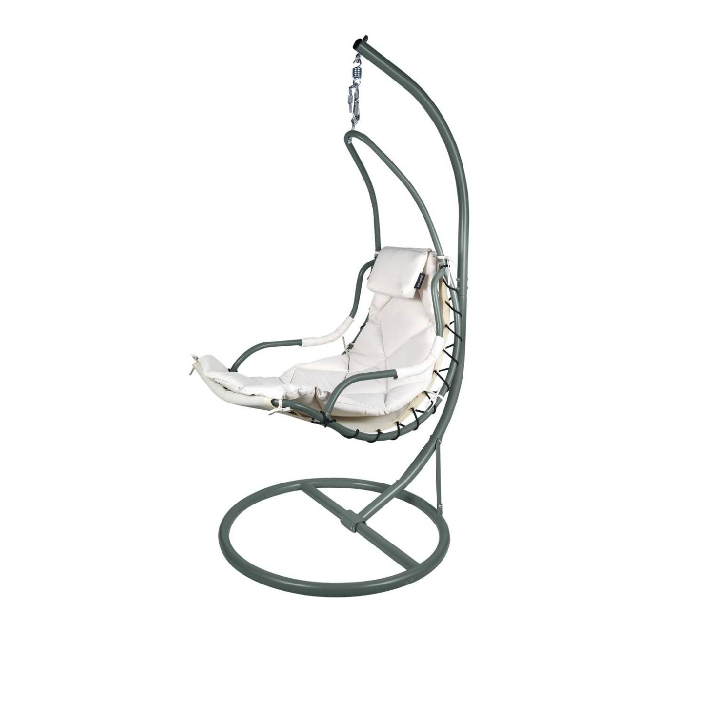 Hollywoodschaukel aus Ton und grünem Gestell aus Eisen